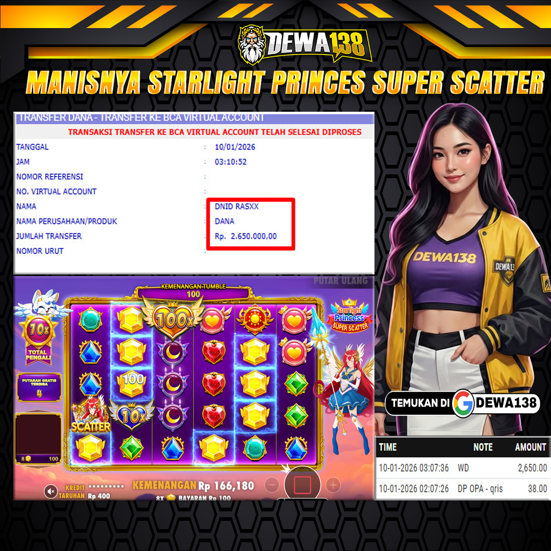 Gabung bersama DEWA138 dan Dapatkan kesempatan jackpot sensasional dalam 15 menit seperti bukti banner ini bukan sekedar janji hanya Depo 38k Withdraw 2,6+ juta hari ini.